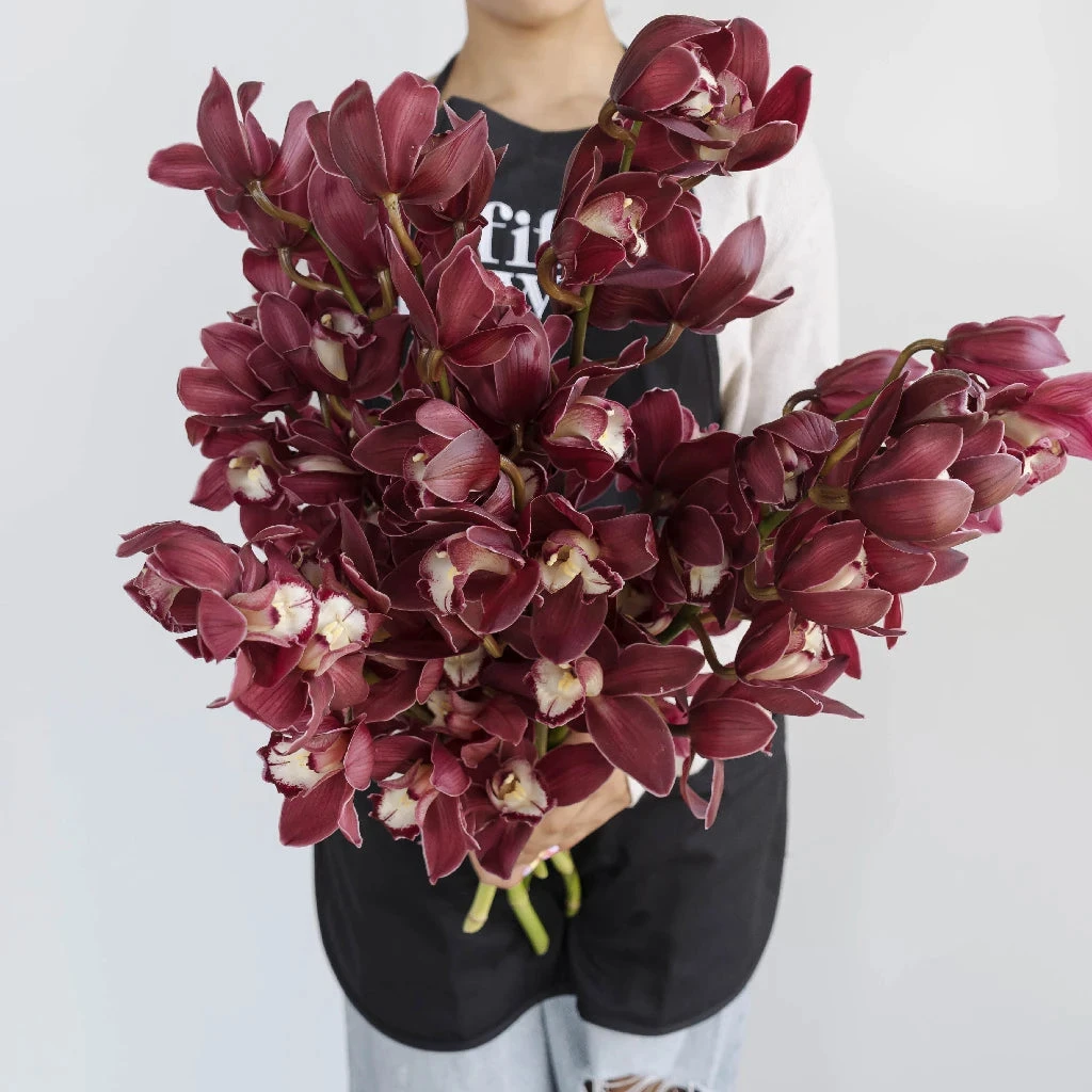 The Merlot Pink Cymbidium Orchid is an exquisite flower that will steal the show in any floral arrangement. This deep pink blossom exudes elegance and captivates with its velvety texture, leaving a lasting impression. It beautifully complements ivory roses, sprigs of eucalyptus, and lush peonies, making it the perfect choice when you want to make a statement. Its vibrant color adds a striking contrast or a delightful mix of maroons. For a stunning fall look, consider pairing it with flowers like terracotta roses or dark ranunculus in your arrangements.