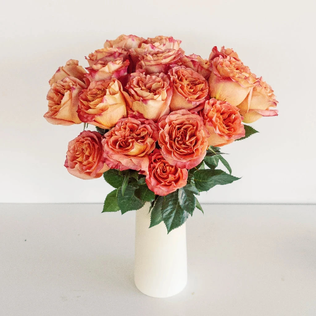 Add spontaneous color to garden-inspired arrangements with Garden Roses Apricot Blend. Garden roses are cup-shaped blooms with densely packed petals that swirl outwards from the center of the bloom. The petals have a warm blend of apricot tones, with pink, orange, and yellow hues throughout. Pair with blooms like David Austin roses peach Juliet Ausgameson, orange ranunculus bulk flowers, white ranunculus fresh flowers, and sweet peas light pink fowers.