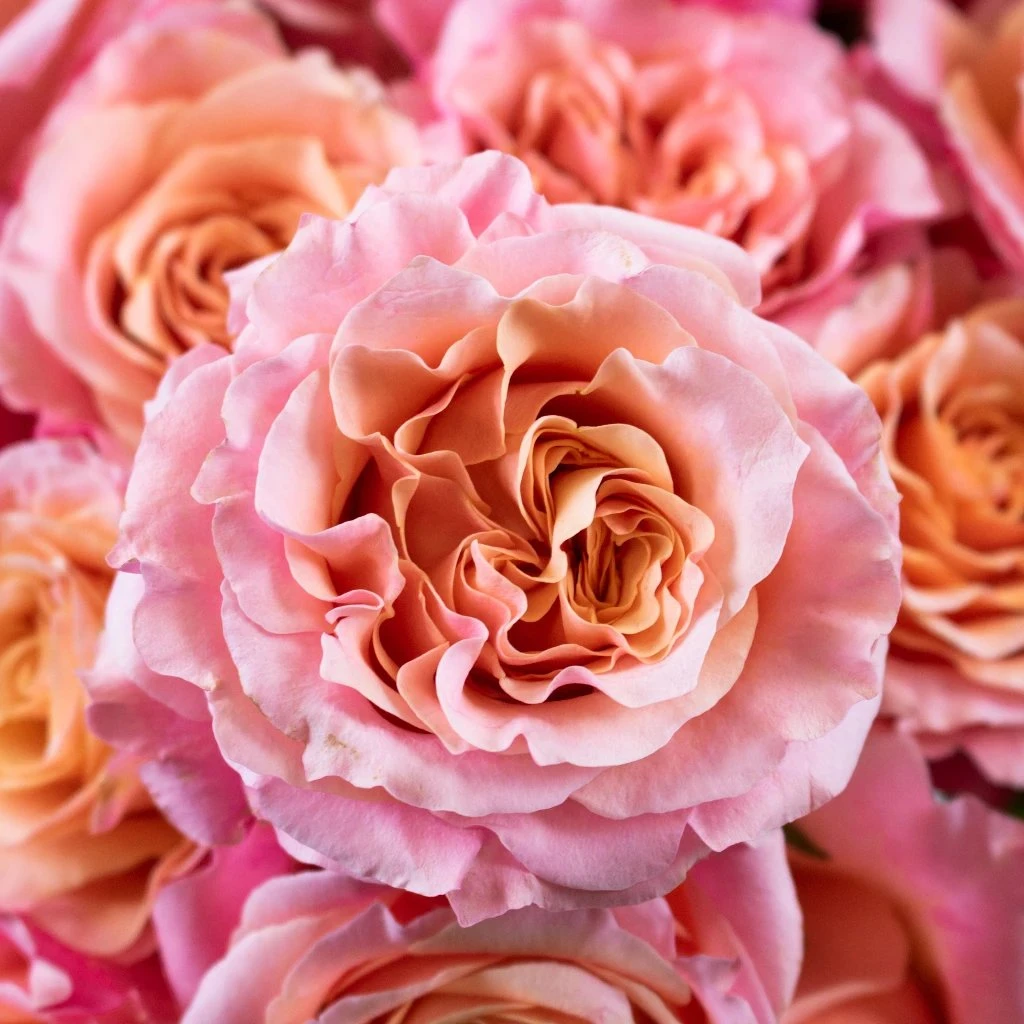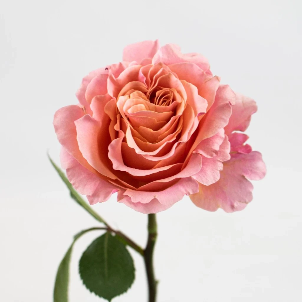 Peony Rose Peach Ruffles is a ruffled peach of a flower. Full headed, dense petaled and sweet scented, you cannot go wrong with a rose like this. This rose will arrive with its lighter pink petals stealing the show, but once it blooms open you’ll see the darker pink and peach tones come in. Use these delicious rose for a bridal shower, luxurious wedding or just because. Bunched together these blooms make a stunning bouquet, but you can also add ranunculus, hypericum berries and greens for a truly fairytale arrangement.